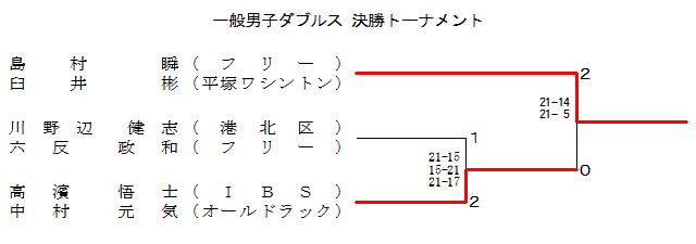 | 川野辺 健志 (港北区) 六反 政和 (フリー) | ○ 18-21 21-17 21-16 | ○ 21-18 21-12 | 1 | |
