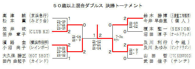 | 50歳以上混合ダブルス Gブロック | 坂本 鈴木 | 稲村 鈴木 | 及川 及川 | 重野 櫻田 | 順位 |