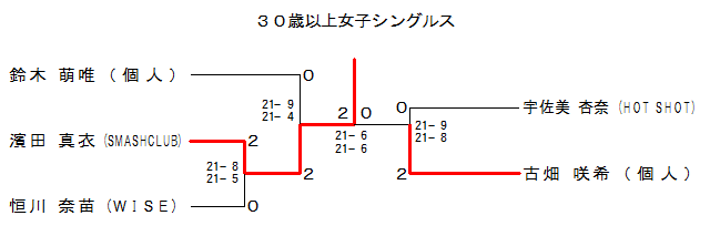 | 30WS-3 | 個人 | 古畑 咲希 | 2 | 21- 9 21- 8 | 0 | 宇佐美杏奈 | HOT SHOT | |