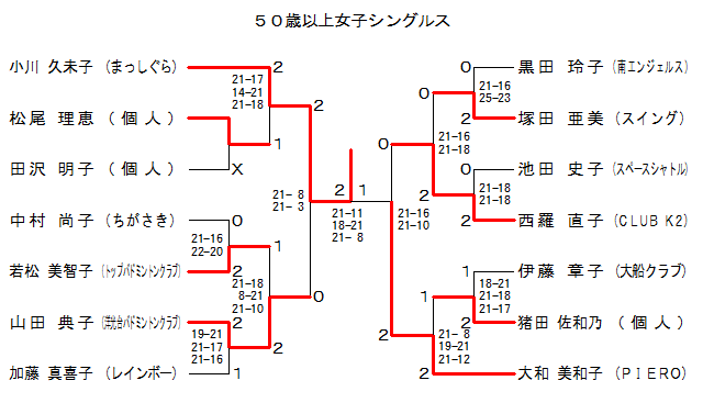 | 50WS-3 | 洋光台C. | 山田 典子 | 2 | 19-21 21-17 21-16 | 1 | 加藤真喜子 | レインボー | |